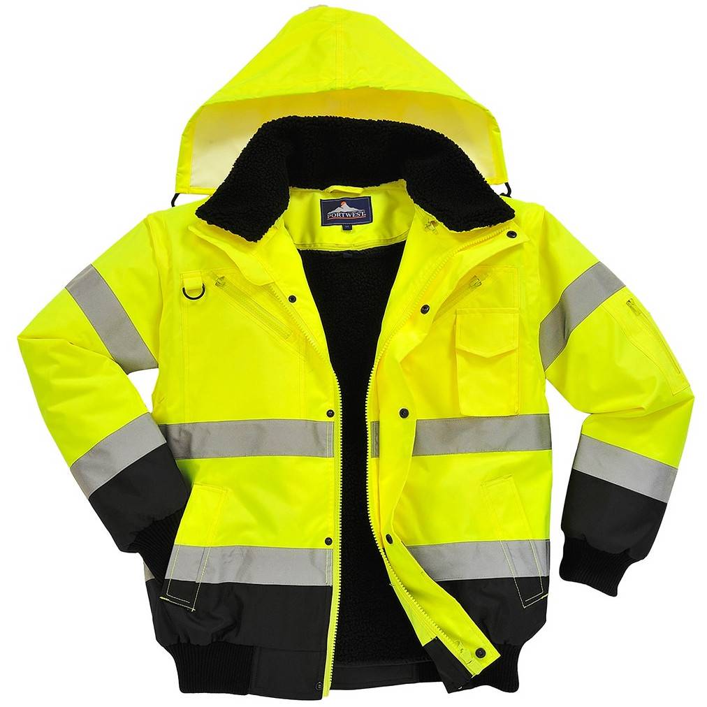 Portwest C465 Hi-Vis Contrast Bomber Jacket SKU: WC-6519 Ship to Select country United Kingdom of Great Britain and Northern Ireland United States of America Afghanistan Åland Islands Albania Algeria American Samoa Andorra Angola Anguilla Antarctica Antigua and Barbuda Argentina Armenia Aruba Austria Azerbaijan Bahamas Bahrain Bangladesh Barbados Belarus Belgium Belize Benin Bermuda Bhutan Bolivia (Plurinational State of) Bonaire, Sint Eustatius and Saba Bosnia and Herzegovina Botswana Bouvet Island Brazil British Indian Ocean Territory Brunei Darussalam Bulgaria Burkina Faso Burundi Cabo Verde Cambodia Cameroon Canada Cayman Islands Central African Republic Chad Chile China Christmas Island Cocos (Keeling) Islands Colombia Comoros Congo Congo (Democratic Republic of the) Cook Islands Costa Rica Côte d'Ivoire Croatia Cuba Curaçao Cyprus Czechia Denmark Djibouti Dominica Dominican Republic Ecuador Egypt El Salvador Equatorial Guinea Eritrea Estonia Eswatini Ethiopia Falkland Islands (Malvinas) Faroe Islands Fiji Finland France French Guiana French Polynesia French Southern Territories Gabon Gambia Georgia Germany Ghana Gibraltar Greece Greenland Grenada Guadeloupe Guam Guatemala Guernsey Guinea Guinea-Bissau Guyana Haiti Heard Island and McDonald Islands Holy See Honduras Hong Kong Hungary Iceland India Indonesia Iran (Islamic Republic of) Iraq Ireland Isle of Man Israel Italy Jamaica Japan Jersey Jordan Kazakhstan Kenya Kiribati Korea (Democratic People's Republic of) Korea (Republic of) Kuwait Kyrgyzstan Lao People's Democratic Republic Latvia Lebanon Lesotho Liberia Libya Liechtenstein Lithuania Luxembourg Macao Madagascar Malawi Malaysia Maldives Mali Malta Marshall Islands Martinique Mauritania Mauritius Mayotte Mexico Micronesia (Federated States of) Moldova (Republic of) Monaco Mongolia Montenegro Montserrat Morocco Mozambique Myanmar Namibia Nauru Nepal Netherlands New Caledonia New Zealand Nicaragua Niger Nigeria Niue Norfolk Island North Macedonia Northern Mariana Islands Norway Oman Pakistan Palau Palestine, State of Panama Papua New Guinea Paraguay Peru Philippines Pitcairn Poland Portugal Puerto Rico Qatar Réunion Romania Russian Federation Rwanda Saint Barthélemy Saint Helena, Ascension and Tristan da Cunha Saint Kitts and Nevis Saint Lucia Saint Martin (French part) Saint Pierre and Miquelon Saint Vincent and the Grenadines Samoa San Marino Sao Tome and Principe Saudi Arabia Senegal Serbia Seychelles Sierra Leone Singapore Sint Maarten (Dutch part) Slovakia Slovenia Solomon Islands Somalia South Africa South Georgia and the South Sandwich Islands South Sudan Spain Sri Lanka Sudan Suriname Svalbard and Jan Mayen Sweden Switzerland Syrian Arab Republic Taiwan, Province of China Tajikistan Tanzania, United Republic of Thailand Timor-Leste Togo Tokelau Tonga Trinidad and Tobago Tunisia Turkey Turkmenistan Turks and Caicos Islands Tuvalu Uganda Ukraine United Arab Emirates United States Minor Outlying Islands Uruguay Uzbekistan Vanuatu Venezuela (Bolivarian Republic of) Vietnam Virgin Islands (British) Virgin Islands (U.S.) Wallis and Futuna Western Sahara Yemen Zambia Zimbabwe * Other * Shipping Method Name Estimated Delivery Price No shipping options Apply Email a friend Versatile and comfortable protection against all weather conditions. The detachable fur lining and collar in combination with the zip-out sleeves, prove this is a superbly adaptable garment. Numerous zipped outer and interior pockets afford excellent personal security. \n \n- CE certified \n- Taped seams to provide additional protection \n- Reflective tape for increased visibility \n- Detachable sleeves, fur liner and fur collar provide multi-way options for the wearer \n- Jacket can be worn three ways for multi use \n- 8 pockets for ample storage \n- Phone pocket \n- Two-way zip for quick and easy access \n- Concealed detachable hood \n- Knitted cuffs and hem \n- Half elasticated waist for a secure and comfortable fit \n- Radio loop for easy clipping of a radio \n- D-ring for keys or ID cards \n- 50+ UPF rated fabric to block 98% of UV rays \n- Extremely water resistant fabric finish, water beads away from fabric surface \n- Certified to EN ISO 20471 after 50x washes \n- Interactive zip for added functionality \n- Detachable fur collar \n- Bio motion tape pattern to improve recognition of human shape at distance \n- Wind resistant to protect against wind chill \n \nColours: Yellow/Navy, Orange/Navy, Yellow/Black, Yellow/Grey, Red/Navy, Yellow/Royal \n \nSizes: \n \nYellow/Navy Reg XS - 6XL \nOrange/Navy Reg S - 5XL \nYellow/Black Reg S - 3XL \nYellow/Grey Reg S - 3XL \nRed/Navy Reg S - 3XL \nYellow/Royal Reg S - 3XL \n \n- ANSI/ISEA 107-2015 TYPE R CLASS 3 \n- AS/NZS 4602.1:2011 Class D/N \n- RIS-3279-TOM ISSUE 1 (ORANGE ONLY) \n- EN ISO 20471 Class 3 \n- GO/RT 3279 Issue 8 (orange only) \n- EN 343 Class 3:1