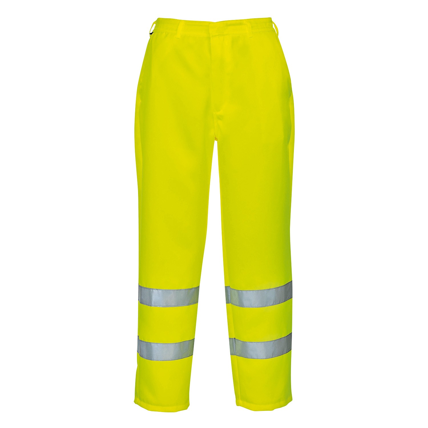 Portwest E041 Hi-Vis Polycotton Pants SKU: WC-6509 Ship to Select country United Kingdom of Great Britain and Northern Ireland United States of America Afghanistan Åland Islands Albania Algeria American Samoa Andorra Angola Anguilla Antarctica Antigua and Barbuda Argentina Armenia Aruba Austria Azerbaijan Bahamas Bahrain Bangladesh Barbados Belarus Belgium Belize Benin Bermuda Bhutan Bolivia (Plurinational State of) Bonaire, Sint Eustatius and Saba Bosnia and Herzegovina Botswana Bouvet Island Brazil British Indian Ocean Territory Brunei Darussalam Bulgaria Burkina Faso Burundi Cabo Verde Cambodia Cameroon Canada Cayman Islands Central African Republic Chad Chile China Christmas Island Cocos (Keeling) Islands Colombia Comoros Congo Congo (Democratic Republic of the) Cook Islands Costa Rica Côte d'Ivoire Croatia Cuba Curaçao Cyprus Czechia Denmark Djibouti Dominica Dominican Republic Ecuador Egypt El Salvador Equatorial Guinea Eritrea Estonia Eswatini Ethiopia Falkland Islands (Malvinas) Faroe Islands Fiji Finland France French Guiana French Polynesia French Southern Territories Gabon Gambia Georgia Germany Ghana Gibraltar Greece Greenland Grenada Guadeloupe Guam Guatemala Guernsey Guinea Guinea-Bissau Guyana Haiti Heard Island and McDonald Islands Holy See Honduras Hong Kong Hungary Iceland India Indonesia Iran (Islamic Republic of) Iraq Ireland Isle of Man Israel Italy Jamaica Japan Jersey Jordan Kazakhstan Kenya Kiribati Korea (Democratic People's Republic of) Korea (Republic of) Kuwait Kyrgyzstan Lao People's Democratic Republic Latvia Lebanon Lesotho Liberia Libya Liechtenstein Lithuania Luxembourg Macao Madagascar Malawi Malaysia Maldives Mali Malta Marshall Islands Martinique Mauritania Mauritius Mayotte Mexico Micronesia (Federated States of) Moldova (Republic of) Monaco Mongolia Montenegro Montserrat Morocco Mozambique Myanmar Namibia Nauru Nepal Netherlands New Caledonia New Zealand Nicaragua Niger Nigeria Niue Norfolk Island North Macedonia Northern Mariana Islands Norway Oman Pakistan Palau Palestine, State of Panama Papua New Guinea Paraguay Peru Philippines Pitcairn Poland Portugal Puerto Rico Qatar Réunion Romania Russian Federation Rwanda Saint Barthélemy Saint Helena, Ascension and Tristan da Cunha Saint Kitts and Nevis Saint Lucia Saint Martin (French part) Saint Pierre and Miquelon Saint Vincent and the Grenadines Samoa San Marino Sao Tome and Principe Saudi Arabia Senegal Serbia Seychelles Sierra Leone Singapore Sint Maarten (Dutch part) Slovakia Slovenia Solomon Islands Somalia South Africa South Georgia and the South Sandwich Islands South Sudan Spain Sri Lanka Sudan Suriname Svalbard and Jan Mayen Sweden Switzerland Syrian Arab Republic Taiwan, Province of China Tajikistan Tanzania, United Republic of Thailand Timor-Leste Togo Tokelau Tonga Trinidad and Tobago Tunisia Turkey Turkmenistan Turks and Caicos Islands Tuvalu Uganda Ukraine United Arab Emirates United States Minor Outlying Islands Uruguay Uzbekistan Vanuatu Venezuela (Bolivarian Republic of) Vietnam Virgin Islands (British) Virgin Islands (U.S.) Wallis and Futuna Western Sahara Yemen Zambia Zimbabwe * Other * Shipping Method Name Estimated Delivery Price No shipping options Apply Email a friend A tough, durable trouser that will keep you safe and visible. The HiVisTex tape to lower part of the leg will retain its reflective properties for up to at least 60 washes at industrial temperatures. The elasticated waist means work can be carried out without restrictions. \n \n- Durable polyester/cotton fabric with Texpel stain resistant finish \n- 50+ UPF rated fabric to block 98% of UV rays \n- Reflective tape for increased visibility \n- 3 pockets for ample storage \n- Jetted back pocket \n- Side access pockets \n- Elasticated back waist for a secure fit \n- Certified to EN ISO 20471 after 50x washes \n- Complies with RIS 3279-TOM for rail industry (orange only) \n- CE certified \n- Bartacked at all stress points \n- Premium stain resistant finish repels oil, water and grime \n \nColours: Yellow, Orange \n \nSizes: \n \nYellow Reg S - 3XL, Tall S - XXL \nOrange Reg S - XXL \n \n- ANSI/ISEA 107-2015 SUPPLEMENTAL CLASS E \n- RIS-3279-TOM ISSUE 1 (ORANGE ONLY) \n- EN ISO 20471 Class 1 \n- GO/RT 3279 Issue 8 (orange only) \n- ANSI/ISEA 107-2010 Class E:2