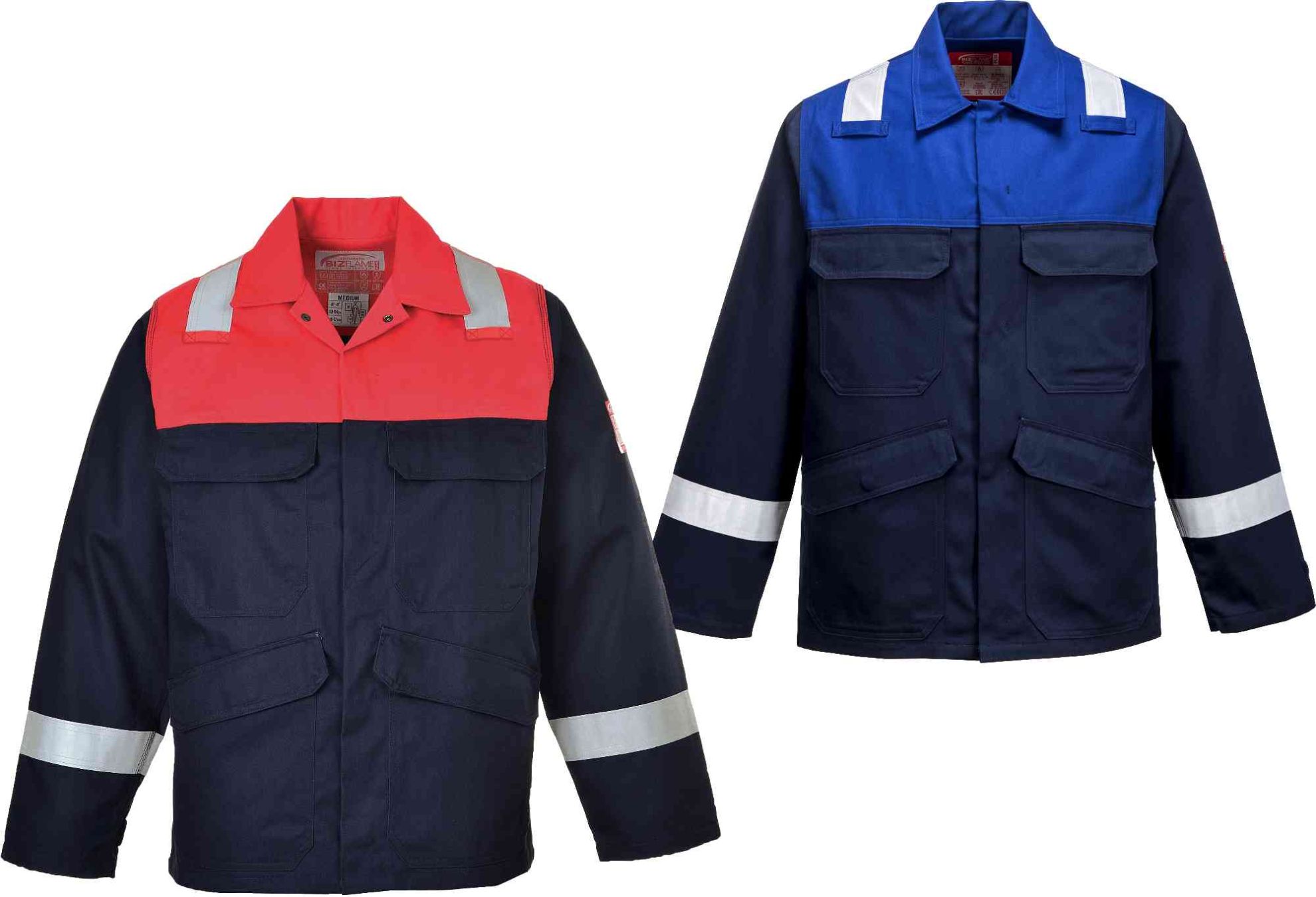 Portwest FR55 Bizflame Plus Jacket SKU: WC-6770 Ship to Select country United Kingdom of Great Britain and Northern Ireland United States of America Afghanistan Åland Islands Albania Algeria American Samoa Andorra Angola Anguilla Antarctica Antigua and Barbuda Argentina Armenia Aruba Austria Azerbaijan Bahamas Bahrain Bangladesh Barbados Belarus Belgium Belize Benin Bermuda Bhutan Bolivia (Plurinational State of) Bonaire, Sint Eustatius and Saba Bosnia and Herzegovina Botswana Bouvet Island Brazil British Indian Ocean Territory Brunei Darussalam Bulgaria Burkina Faso Burundi Cabo Verde Cambodia Cameroon Canada Cayman Islands Central African Republic Chad Chile China Christmas Island Cocos (Keeling) Islands Colombia Comoros Congo Congo (Democratic Republic of the) Cook Islands Costa Rica Côte d'Ivoire Croatia Cuba Curaçao Cyprus Czechia Denmark Djibouti Dominica Dominican Republic Ecuador Egypt El Salvador Equatorial Guinea Eritrea Estonia Eswatini Ethiopia Falkland Islands (Malvinas) Faroe Islands Fiji Finland France French Guiana French Polynesia French Southern Territories Gabon Gambia Georgia Germany Ghana Gibraltar Greece Greenland Grenada Guadeloupe Guam Guatemala Guernsey Guinea Guinea-Bissau Guyana Haiti Heard Island and McDonald Islands Holy See Honduras Hong Kong Hungary Iceland India Indonesia Iran (Islamic Republic of) Iraq Ireland Isle of Man Israel Italy Jamaica Japan Jersey Jordan Kazakhstan Kenya Kiribati Korea (Democratic People's Republic of) Korea (Republic of) Kuwait Kyrgyzstan Lao People's Democratic Republic Latvia Lebanon Lesotho Liberia Libya Liechtenstein Lithuania Luxembourg Macao Madagascar Malawi Malaysia Maldives Mali Malta Marshall Islands Martinique Mauritania Mauritius Mayotte Mexico Micronesia (Federated States of) Moldova (Republic of) Monaco Mongolia Montenegro Montserrat Morocco Mozambique Myanmar Namibia Nauru Nepal Netherlands New Caledonia New Zealand Nicaragua Niger Nigeria Niue Norfolk Island North Macedonia Northern Mariana Islands Norway Oman Pakistan Palau Palestine, State of Panama Papua New Guinea Paraguay Peru Philippines Pitcairn Poland Portugal Puerto Rico Qatar Réunion Romania Russian Federation Rwanda Saint Barthélemy Saint Helena, Ascension and Tristan da Cunha Saint Kitts and Nevis Saint Lucia Saint Martin (French part) Saint Pierre and Miquelon Saint Vincent and the Grenadines Samoa San Marino Sao Tome and Principe Saudi Arabia Senegal Serbia Seychelles Sierra Leone Singapore Sint Maarten (Dutch part) Slovakia Slovenia Solomon Islands Somalia South Africa South Georgia and the South Sandwich Islands South Sudan Spain Sri Lanka Sudan Suriname Svalbard and Jan Mayen Sweden Switzerland Syrian Arab Republic Taiwan, Province of China Tajikistan Tanzania, United Republic of Thailand Timor-Leste Togo Tokelau Tonga Trinidad and Tobago Tunisia Turkey Turkmenistan Turks and Caicos Islands Tuvalu Uganda Ukraine United Arab Emirates United States Minor Outlying Islands Uruguay Uzbekistan Vanuatu Venezuela (Bolivarian Republic of) Vietnam Virgin Islands (British) Virgin Islands (U.S.) Wallis and Futuna Western Sahara Yemen Zambia Zimbabwe * Other * Shipping Method Name Estimated Delivery Price No shipping options Apply Email a friend This Jacket is constructed with high visibility reflective tape double stitched for enhanced visibility. Features include triple stitched seams, high visibility strips on shoulders and arms, concealed front brass zip, two front chest pockets with flap and stud closure. Adjustable sleeve opening. \n \n- CE certified \n- Guaranteed flame resistance for life of garment \n- Protection against radiant, convective and contact heat \n- Certified protection against molten metal splash \n- Class 2 welding protection \n- Flame resistant industrial wash tape \n- Radio loops for easy clipping of a radio \n- Zip opening with concealed press studs \n- 50+ UPF rated fabric to block 98% of UV rays \n- Hook and loop cuffs for a secure fit \n- Triple-stitched seams for extra durability \n- 5 pockets for ample storage \n- Phone pocket \n- Two chest pockets with stud closure \n- Two lower pockets with stud closure \n- Contrast colouring for added style \n- Retail bag which aids presentation for retail sales \n \nColours: Navy/Red, Navy/Royal \n \nSizes: \n \nNavy/Red Reg S - 4XL \nNavy/Royal Reg S - 3XL \n \n- EN 1149 -5 \n- IEC 61482-2 IEC 61482-1-2 Class 1 \n- Fabric conforms to NFPA 2112 \n- EN ISO 11612 (A1+A2. B1. C1. E2. F1) \n- EN ISO 11611 Class 2 (A1+A2) \n- ASTM F1959/F1959M-12 (ATPV=13.6 Cal/cm2 (HAF=82%))
