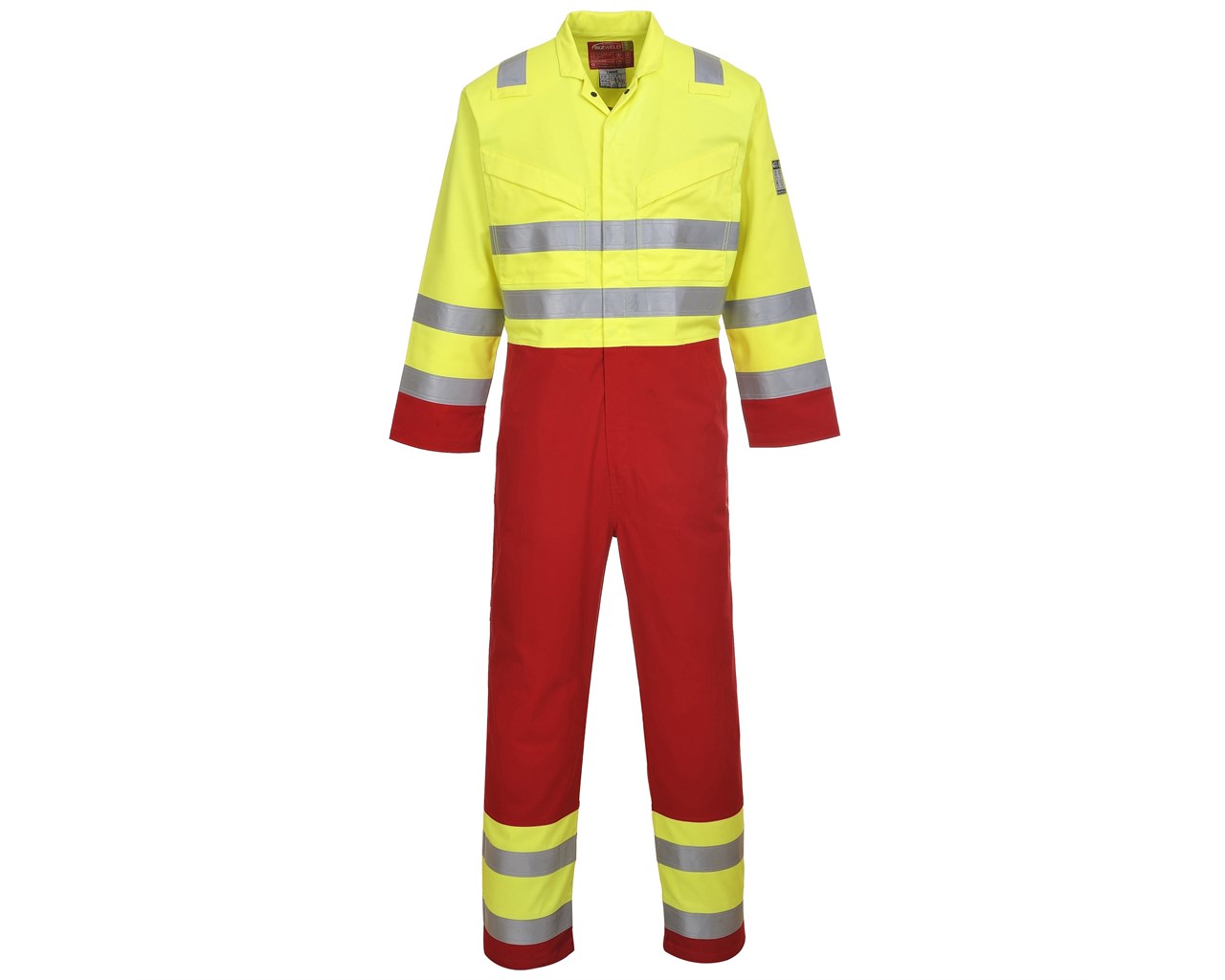 Portwest FR90 Bizflame Services Coverall SKU: WC-6741 Ship to Select country United Kingdom of Great Britain and Northern Ireland United States of America Afghanistan Åland Islands Albania Algeria American Samoa Andorra Angola Anguilla Antarctica Antigua and Barbuda Argentina Armenia Aruba Austria Azerbaijan Bahamas Bahrain Bangladesh Barbados Belarus Belgium Belize Benin Bermuda Bhutan Bolivia (Plurinational State of) Bonaire, Sint Eustatius and Saba Bosnia and Herzegovina Botswana Bouvet Island Brazil British Indian Ocean Territory Brunei Darussalam Bulgaria Burkina Faso Burundi Cabo Verde Cambodia Cameroon Canada Cayman Islands Central African Republic Chad Chile China Christmas Island Cocos (Keeling) Islands Colombia Comoros Congo Congo (Democratic Republic of the) Cook Islands Costa Rica Côte d'Ivoire Croatia Cuba Curaçao Cyprus Czechia Denmark Djibouti Dominica Dominican Republic Ecuador Egypt El Salvador Equatorial Guinea Eritrea Estonia Eswatini Ethiopia Falkland Islands (Malvinas) Faroe Islands Fiji Finland France French Guiana French Polynesia French Southern Territories Gabon Gambia Georgia Germany Ghana Gibraltar Greece Greenland Grenada Guadeloupe Guam Guatemala Guernsey Guinea Guinea-Bissau Guyana Haiti Heard Island and McDonald Islands Holy See Honduras Hong Kong Hungary Iceland India Indonesia Iran (Islamic Republic of) Iraq Ireland Isle of Man Israel Italy Jamaica Japan Jersey Jordan Kazakhstan Kenya Kiribati Korea (Democratic People's Republic of) Korea (Republic of) Kuwait Kyrgyzstan Lao People's Democratic Republic Latvia Lebanon Lesotho Liberia Libya Liechtenstein Lithuania Luxembourg Macao Madagascar Malawi Malaysia Maldives Mali Malta Marshall Islands Martinique Mauritania Mauritius Mayotte Mexico Micronesia (Federated States of) Moldova (Republic of) Monaco Mongolia Montenegro Montserrat Morocco Mozambique Myanmar Namibia Nauru Nepal Netherlands New Caledonia New Zealand Nicaragua Niger Nigeria Niue Norfolk Island North Macedonia Northern Mariana Islands Norway Oman Pakistan Palau Palestine, State of Panama Papua New Guinea Paraguay Peru Philippines Pitcairn Poland Portugal Puerto Rico Qatar Réunion Romania Russian Federation Rwanda Saint Barthélemy Saint Helena, Ascension and Tristan da Cunha Saint Kitts and Nevis Saint Lucia Saint Martin (French part) Saint Pierre and Miquelon Saint Vincent and the Grenadines Samoa San Marino Sao Tome and Principe Saudi Arabia Senegal Serbia Seychelles Sierra Leone Singapore Sint Maarten (Dutch part) Slovakia Slovenia Solomon Islands Somalia South Africa South Georgia and the South Sandwich Islands South Sudan Spain Sri Lanka Sudan Suriname Svalbard and Jan Mayen Sweden Switzerland Syrian Arab Republic Taiwan, Province of China Tajikistan Tanzania, United Republic of Thailand Timor-Leste Togo Tokelau Tonga Trinidad and Tobago Tunisia Turkey Turkmenistan Turks and Caicos Islands Tuvalu Uganda Ukraine United Arab Emirates United States Minor Outlying Islands Uruguay Uzbekistan Vanuatu Venezuela (Bolivarian Republic of) Vietnam Virgin Islands (British) Virgin Islands (U.S.) Wallis and Futuna Western Sahara Yemen Zambia Zimbabwe * Other * Shipping Method Name Estimated Delivery Price No shipping options Apply Email a friend This hi-vis anti-static Coverall has a concealed brass zip on each chest pocket and front opening. This coverall offers the optimum solution for those in a service position. \n \n- CE certified \n- Protection against radiant, convective and contact heat \n- Certified protection against molten metal splash \n- Class 1 welding protection \n- Premium flame resistant reflective tape \n- Knee pad pockets to facilitate knee pads \n- Durable, strong and long lasting brass zip \n- Two-way zip for quick and easy access \n- Radio loops for easy clipping of a radio \n- 50+ UPF rated fabric to block 98% of UV rays \n- 9 pockets for ample storage \n- Hook and loop cuffs for a secure fit \n- Contrast colouring for added style \n- Sleeve pocket \n- Concealed brass zips on chest pockets \n- Rule pocket \n- Quick and easy side access \n \nColours: Yellow/Red \n \nSizes: Reg S - 3XL \n \n- EN 1149 -5 \n- EN ISO 11612 (A1+A2. B1. C1. E3. F1) \n- EN ISO 11611 Class 1 (A1+A2) \n- EN ISO 20471 Class 3