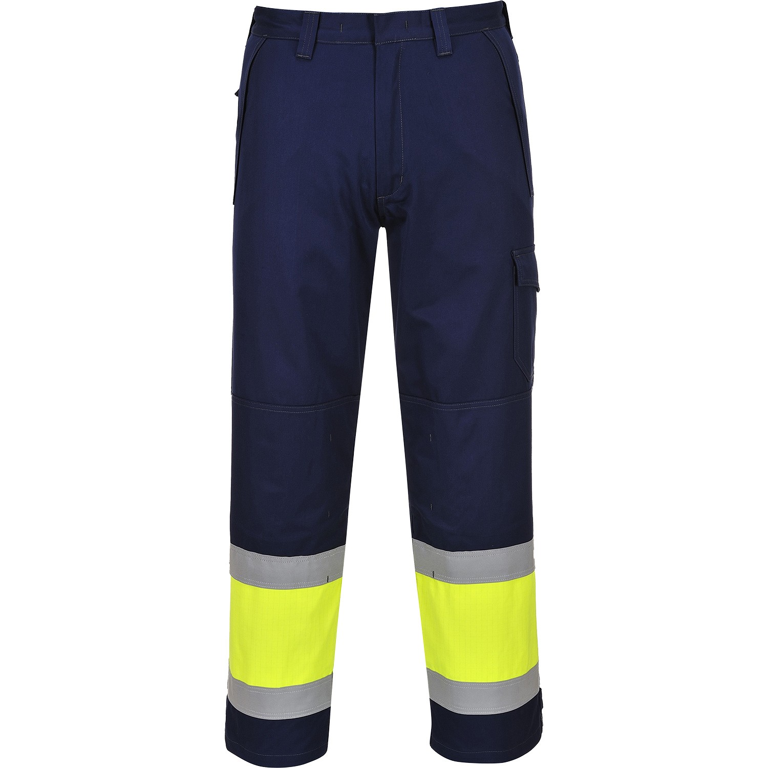 Portwest MV26 Hi-Vis Modaflame Trouser SKU: WC-6830 Ship to Select country United Kingdom of Great Britain and Northern Ireland United States of America Afghanistan Åland Islands Albania Algeria American Samoa Andorra Angola Anguilla Antarctica Antigua and Barbuda Argentina Armenia Aruba Austria Azerbaijan Bahamas Bahrain Bangladesh Barbados Belarus Belgium Belize Benin Bermuda Bhutan Bolivia (Plurinational State of) Bonaire, Sint Eustatius and Saba Bosnia and Herzegovina Botswana Bouvet Island Brazil British Indian Ocean Territory Brunei Darussalam Bulgaria Burkina Faso Burundi Cabo Verde Cambodia Cameroon Canada Cayman Islands Central African Republic Chad Chile China Christmas Island Cocos (Keeling) Islands Colombia Comoros Congo Congo (Democratic Republic of the) Cook Islands Costa Rica Côte d'Ivoire Croatia Cuba Curaçao Cyprus Czechia Denmark Djibouti Dominica Dominican Republic Ecuador Egypt El Salvador Equatorial Guinea Eritrea Estonia Eswatini Ethiopia Falkland Islands (Malvinas) Faroe Islands Fiji Finland France French Guiana French Polynesia French Southern Territories Gabon Gambia Georgia Germany Ghana Gibraltar Greece Greenland Grenada Guadeloupe Guam Guatemala Guernsey Guinea Guinea-Bissau Guyana Haiti Heard Island and McDonald Islands Holy See Honduras Hong Kong Hungary Iceland India Indonesia Iran (Islamic Republic of) Iraq Ireland Isle of Man Israel Italy Jamaica Japan Jersey Jordan Kazakhstan Kenya Kiribati Korea (Democratic People's Republic of) Korea (Republic of) Kuwait Kyrgyzstan Lao People's Democratic Republic Latvia Lebanon Lesotho Liberia Libya Liechtenstein Lithuania Luxembourg Macao Madagascar Malawi Malaysia Maldives Mali Malta Marshall Islands Martinique Mauritania Mauritius Mayotte Mexico Micronesia (Federated States of) Moldova (Republic of) Monaco Mongolia Montenegro Montserrat Morocco Mozambique Myanmar Namibia Nauru Nepal Netherlands New Caledonia New Zealand Nicaragua Niger Nigeria Niue Norfolk Island North Macedonia Northern Mariana Islands Norway Oman Pakistan Palau Palestine, State of Panama Papua New Guinea Paraguay Peru Philippines Pitcairn Poland Portugal Puerto Rico Qatar Réunion Romania Russian Federation Rwanda Saint Barthélemy Saint Helena, Ascension and Tristan da Cunha Saint Kitts and Nevis Saint Lucia Saint Martin (French part) Saint Pierre and Miquelon Saint Vincent and the Grenadines Samoa San Marino Sao Tome and Principe Saudi Arabia Senegal Serbia Seychelles Sierra Leone Singapore Sint Maarten (Dutch part) Slovakia Slovenia Solomon Islands Somalia South Africa South Georgia and the South Sandwich Islands South Sudan Spain Sri Lanka Sudan Suriname Svalbard and Jan Mayen Sweden Switzerland Syrian Arab Republic Taiwan, Province of China Tajikistan Tanzania, United Republic of Thailand Timor-Leste Togo Tokelau Tonga Trinidad and Tobago Tunisia Turkey Turkmenistan Turks and Caicos Islands Tuvalu Uganda Ukraine United Arab Emirates United States Minor Outlying Islands Uruguay Uzbekistan Vanuatu Venezuela (Bolivarian Republic of) Vietnam Virgin Islands (British) Virgin Islands (U.S.) Wallis and Futuna Western Sahara Yemen Zambia Zimbabwe * Other * Shipping Method Name Estimated Delivery Price No shipping options Apply Email a friend Conforming to multiple EN standards, these trousers offer ideal protection against exposure to industrial hazards. The elasticated back waist allows for freedom of movement and ensures the garment sits comfortably. \n \n- CE certified \n- Inherent flame resistant qualities will not diminish with washing \n- Protection against radiant, convective and contact heat \n- Class 1 welding protection \n- Flame resistant industrial wash tape \n- Two tier knee pad pockets allowing two positioning options \n- Durable, strong and long lasting brass zip \n- Triple-stitched seams for extra durability \n- 9 pockets for ample storage \n- Concealed phone pocket \n- Elasticated back waist for a secure fit \n- 50+ UPF rated fabric to block 98% of UV rays \n- Spacious pockets \n- Rule pocket \n- Two back patch pockets \n \nColours: Yellow/Navy \n \nSizes: Reg S - 3XL, Tall M - XXL \n \n- AS/NZS 1906.4:2010 \n- EN 1149 -5 \n- EN ISO 11612 (A1+A2. B2. C1. F1) \n- EN ISO 11611 Class 1 (A1+A2) \n- IEC 61482-2 IEC 61482-1-2 Class 1 \n- EN ISO 20471 Class 1 \n- ASTM F1959/F1959M-12 (ATPV=8.4 Cal/cm2 (HAF=75.8%))