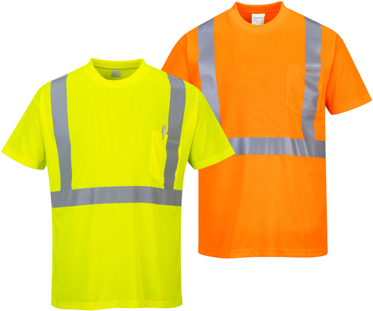 Portwest S190 Hi-Vis Pocket T-Shirt SKU: WC-7042 Ship to Select country United Kingdom of Great Britain and Northern Ireland United States of America Afghanistan Åland Islands Albania Algeria American Samoa Andorra Angola Anguilla Antarctica Antigua and Barbuda Argentina Armenia Aruba Austria Azerbaijan Bahamas Bahrain Bangladesh Barbados Belarus Belgium Belize Benin Bermuda Bhutan Bolivia (Plurinational State of) Bonaire, Sint Eustatius and Saba Bosnia and Herzegovina Botswana Bouvet Island Brazil British Indian Ocean Territory Brunei Darussalam Bulgaria Burkina Faso Burundi Cabo Verde Cambodia Cameroon Canada Cayman Islands Central African Republic Chad Chile China Christmas Island Cocos (Keeling) Islands Colombia Comoros Congo Congo (Democratic Republic of the) Cook Islands Costa Rica Côte d'Ivoire Croatia Cuba Curaçao Cyprus Czechia Denmark Djibouti Dominica Dominican Republic Ecuador Egypt El Salvador Equatorial Guinea Eritrea Estonia Eswatini Ethiopia Falkland Islands (Malvinas) Faroe Islands Fiji Finland France French Guiana French Polynesia French Southern Territories Gabon Gambia Georgia Germany Ghana Gibraltar Greece Greenland Grenada Guadeloupe Guam Guatemala Guernsey Guinea Guinea-Bissau Guyana Haiti Heard Island and McDonald Islands Holy See Honduras Hong Kong Hungary Iceland India Indonesia Iran (Islamic Republic of) Iraq Ireland Isle of Man Israel Italy Jamaica Japan Jersey Jordan Kazakhstan Kenya Kiribati Korea (Democratic People's Republic of) Korea (Republic of) Kuwait Kyrgyzstan Lao People's Democratic Republic Latvia Lebanon Lesotho Liberia Libya Liechtenstein Lithuania Luxembourg Macao Madagascar Malawi Malaysia Maldives Mali Malta Marshall Islands Martinique Mauritania Mauritius Mayotte Mexico Micronesia (Federated States of) Moldova (Republic of) Monaco Mongolia Montenegro Montserrat Morocco Mozambique Myanmar Namibia Nauru Nepal Netherlands New Caledonia New Zealand Nicaragua Niger Nigeria Niue Norfolk Island North Macedonia Northern Mariana Islands Norway Oman Pakistan Palau Palestine, State of Panama Papua New Guinea Paraguay Peru Philippines Pitcairn Poland Portugal Puerto Rico Qatar Réunion Romania Russian Federation Rwanda Saint Barthélemy Saint Helena, Ascension and Tristan da Cunha Saint Kitts and Nevis Saint Lucia Saint Martin (French part) Saint Pierre and Miquelon Saint Vincent and the Grenadines Samoa San Marino Sao Tome and Principe Saudi Arabia Senegal Serbia Seychelles Sierra Leone Singapore Sint Maarten (Dutch part) Slovakia Slovenia Solomon Islands Somalia South Africa South Georgia and the South Sandwich Islands South Sudan Spain Sri Lanka Sudan Suriname Svalbard and Jan Mayen Sweden Switzerland Syrian Arab Republic Taiwan, Province of China Tajikistan Tanzania, United Republic of Thailand Timor-Leste Togo Tokelau Tonga Trinidad and Tobago Tunisia Turkey Turkmenistan Turks and Caicos Islands Tuvalu Uganda Ukraine United Arab Emirates United States Minor Outlying Islands Uruguay Uzbekistan Vanuatu Venezuela (Bolivarian Republic of) Vietnam Virgin Islands (British) Virgin Islands (U.S.) Wallis and Futuna Western Sahara Yemen Zambia Zimbabwe * Other * Shipping Method Name Estimated Delivery Price No shipping options Apply Email a friend This pocket t-shirt uses moisture wicking polyester fabric. Features include a pocket on the left chest, a crew neck, a taped neck seam for extra comfort and reflective heat seal tape for enhanced visibility. \n \n- Breathable fabric to draw moisture away from the body keeping the wearer cool, dry and comfortable \n- Quality wicking fabric finish enhances fabric drying and aids stain removal \n- Heat-sealed reflective tape for added visibility \n- 50+ UPF rated fabric to block 98% of UV rays \n- Lightweight and comfortable \n- 1 pocket for secure storage \n- Crew neck \n- Taped neck seam for extra comfort \n- Complies with EN ISO 20471 standard \n- Complies with RIS 3279-TOM for rail industry (orange only) \n- CE certified \n \nColours: Orange, Yellow \n \nSizes: Reg S - 5XL \n \n- ANSI/ISEA 107-2015 TYPE R CLASS 2 \n- EN ISO 20471 Class 2 \n- RIS-3279-TOM ISSUE 1 (ORANGE ONLY) \n- GO/RT 3279 Issue 8 (orange only)