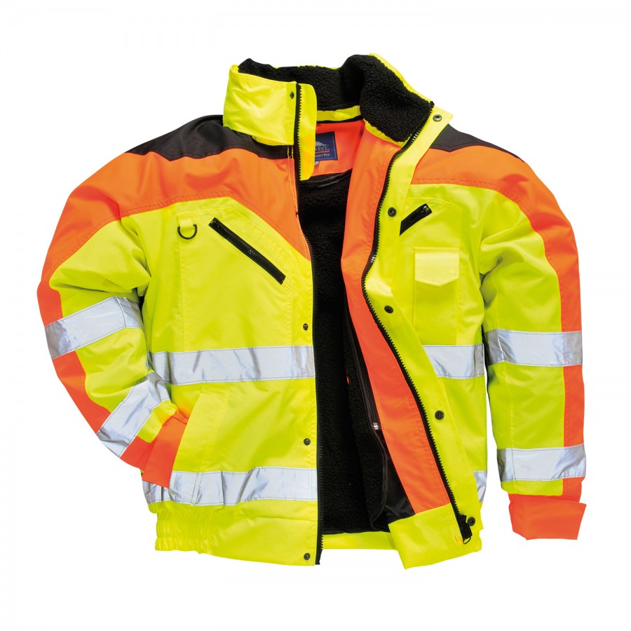 Portwest S464 Hi-Vis Contrast Plus Bomber Jacket SKU: WC-6978 Ship to Select country United Kingdom of Great Britain and Northern Ireland United States of America Afghanistan Åland Islands Albania Algeria American Samoa Andorra Angola Anguilla Antarctica Antigua and Barbuda Argentina Armenia Aruba Austria Azerbaijan Bahamas Bahrain Bangladesh Barbados Belarus Belgium Belize Benin Bermuda Bhutan Bolivia (Plurinational State of) Bonaire, Sint Eustatius and Saba Bosnia and Herzegovina Botswana Bouvet Island Brazil British Indian Ocean Territory Brunei Darussalam Bulgaria Burkina Faso Burundi Cabo Verde Cambodia Cameroon Canada Cayman Islands Central African Republic Chad Chile China Christmas Island Cocos (Keeling) Islands Colombia Comoros Congo Congo (Democratic Republic of the) Cook Islands Costa Rica Côte d'Ivoire Croatia Cuba Curaçao Cyprus Czechia Denmark Djibouti Dominica Dominican Republic Ecuador Egypt El Salvador Equatorial Guinea Eritrea Estonia Eswatini Ethiopia Falkland Islands (Malvinas) Faroe Islands Fiji Finland France French Guiana French Polynesia French Southern Territories Gabon Gambia Georgia Germany Ghana Gibraltar Greece Greenland Grenada Guadeloupe Guam Guatemala Guernsey Guinea Guinea-Bissau Guyana Haiti Heard Island and McDonald Islands Holy See Honduras Hong Kong Hungary Iceland India Indonesia Iran (Islamic Republic of) Iraq Ireland Isle of Man Israel Italy Jamaica Japan Jersey Jordan Kazakhstan Kenya Kiribati Korea (Democratic People's Republic of) Korea (Republic of) Kuwait Kyrgyzstan Lao People's Democratic Republic Latvia Lebanon Lesotho Liberia Libya Liechtenstein Lithuania Luxembourg Macao Madagascar Malawi Malaysia Maldives Mali Malta Marshall Islands Martinique Mauritania Mauritius Mayotte Mexico Micronesia (Federated States of) Moldova (Republic of) Monaco Mongolia Montenegro Montserrat Morocco Mozambique Myanmar Namibia Nauru Nepal Netherlands New Caledonia New Zealand Nicaragua Niger Nigeria Niue Norfolk Island North Macedonia Northern Mariana Islands Norway Oman Pakistan Palau Palestine, State of Panama Papua New Guinea Paraguay Peru Philippines Pitcairn Poland Portugal Puerto Rico Qatar Réunion Romania Russian Federation Rwanda Saint Barthélemy Saint Helena, Ascension and Tristan da Cunha Saint Kitts and Nevis Saint Lucia Saint Martin (French part) Saint Pierre and Miquelon Saint Vincent and the Grenadines Samoa San Marino Sao Tome and Principe Saudi Arabia Senegal Serbia Seychelles Sierra Leone Singapore Sint Maarten (Dutch part) Slovakia Slovenia Solomon Islands Somalia South Africa South Georgia and the South Sandwich Islands South Sudan Spain Sri Lanka Sudan Suriname Svalbard and Jan Mayen Sweden Switzerland Syrian Arab Republic Taiwan, Province of China Tajikistan Tanzania, United Republic of Thailand Timor-Leste Togo Tokelau Tonga Trinidad and Tobago Tunisia Turkey Turkmenistan Turks and Caicos Islands Tuvalu Uganda Ukraine United Arab Emirates United States Minor Outlying Islands Uruguay Uzbekistan Vanuatu Venezuela (Bolivarian Republic of) Vietnam Virgin Islands (British) Virgin Islands (U.S.) Wallis and Futuna Western Sahara Yemen Zambia Zimbabwe * Other * Shipping Method Name Estimated Delivery Price No shipping options Apply Email a friend Be seen in all conditions with this innovative concept in Hi-Vis bomber jackets. This garment sports a zip out fur lining, detachable fur collar, concealed hood, security pocket and zip front. All seams are taped. \n \n- CE certified \n- Waterproof with taped seams preventing water penetration \n- Reflective tape for increased visibility \n- Detachable sleeves, fur liner and fur collar provide multi-way options for the wearer \n- 8 pockets for ample storage \n- Phone pocket \n- Zipped pockets \n- Two-way front plastic moulded zip for quick and easy access \n- Pack away hood for added functionality \n- Hook and loop hems for a secure fit \n- Elasticated cuffs for a secure fit \n- Half elasticated waist for a secure and comfortable fit \n- D-ring for keys or ID cards \n- 50+ UPF rated fabric to block 98% of UV rays \n- Extremely water resistant fabric finish, water beads away from fabric surface \n- Certified to EN ISO 20471 after 50x washes \n \nColours: Yellow 3-Tone, Orange 3-Tone \n \nSizes: \n \nYellow 3-Tone Reg S - 3XL \nOrange 3-Tone Reg S - XXL \n \n- EN ISO 20471 Class 3 \n- EN 343 Class 3:1