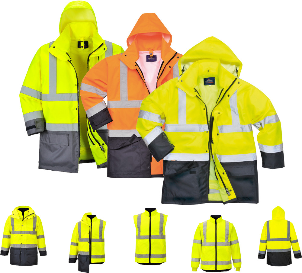 Portwest S768 Hi-Vis Executive 5-in-1 Jacket SKU: WC-7000 Ship to Select country United Kingdom of Great Britain and Northern Ireland United States of America Afghanistan Åland Islands Albania Algeria American Samoa Andorra Angola Anguilla Antarctica Antigua and Barbuda Argentina Armenia Aruba Austria Azerbaijan Bahamas Bahrain Bangladesh Barbados Belarus Belgium Belize Benin Bermuda Bhutan Bolivia (Plurinational State of) Bonaire, Sint Eustatius and Saba Bosnia and Herzegovina Botswana Bouvet Island Brazil British Indian Ocean Territory Brunei Darussalam Bulgaria Burkina Faso Burundi Cabo Verde Cambodia Cameroon Canada Cayman Islands Central African Republic Chad Chile China Christmas Island Cocos (Keeling) Islands Colombia Comoros Congo Congo (Democratic Republic of the) Cook Islands Costa Rica Côte d'Ivoire Croatia Cuba Curaçao Cyprus Czechia Denmark Djibouti Dominica Dominican Republic Ecuador Egypt El Salvador Equatorial Guinea Eritrea Estonia Eswatini Ethiopia Falkland Islands (Malvinas) Faroe Islands Fiji Finland France French Guiana French Polynesia French Southern Territories Gabon Gambia Georgia Germany Ghana Gibraltar Greece Greenland Grenada Guadeloupe Guam Guatemala Guernsey Guinea Guinea-Bissau Guyana Haiti Heard Island and McDonald Islands Holy See Honduras Hong Kong Hungary Iceland India Indonesia Iran (Islamic Republic of) Iraq Ireland Isle of Man Israel Italy Jamaica Japan Jersey Jordan Kazakhstan Kenya Kiribati Korea (Democratic People's Republic of) Korea (Republic of) Kuwait Kyrgyzstan Lao People's Democratic Republic Latvia Lebanon Lesotho Liberia Libya Liechtenstein Lithuania Luxembourg Macao Madagascar Malawi Malaysia Maldives Mali Malta Marshall Islands Martinique Mauritania Mauritius Mayotte Mexico Micronesia (Federated States of) Moldova (Republic of) Monaco Mongolia Montenegro Montserrat Morocco Mozambique Myanmar Namibia Nauru Nepal Netherlands New Caledonia New Zealand Nicaragua Niger Nigeria Niue Norfolk Island North Macedonia Northern Mariana Islands Norway Oman Pakistan Palau Palestine, State of Panama Papua New Guinea Paraguay Peru Philippines Pitcairn Poland Portugal Puerto Rico Qatar Réunion Romania Russian Federation Rwanda Saint Barthélemy Saint Helena, Ascension and Tristan da Cunha Saint Kitts and Nevis Saint Lucia Saint Martin (French part) Saint Pierre and Miquelon Saint Vincent and the Grenadines Samoa San Marino Sao Tome and Principe Saudi Arabia Senegal Serbia Seychelles Sierra Leone Singapore Sint Maarten (Dutch part) Slovakia Slovenia Solomon Islands Somalia South Africa South Georgia and the South Sandwich Islands South Sudan Spain Sri Lanka Sudan Suriname Svalbard and Jan Mayen Sweden Switzerland Syrian Arab Republic Taiwan, Province of China Tajikistan Tanzania, United Republic of Thailand Timor-Leste Togo Tokelau Tonga Trinidad and Tobago Tunisia Turkey Turkmenistan Turks and Caicos Islands Tuvalu Uganda Ukraine United Arab Emirates United States Minor Outlying Islands Uruguay Uzbekistan Vanuatu Venezuela (Bolivarian Republic of) Vietnam Virgin Islands (British) Virgin Islands (U.S.) Wallis and Futuna Western Sahara Yemen Zambia Zimbabwe * Other * Shipping Method Name Estimated Delivery Price No shipping options Apply Email a friend An innovative style adaptable for multiple uses. Outer jacket contains two useful large patch pockets with hook and loop closures and a concealed hood, whilst the inner jacket has detachable fleece sleeves, 2 roomy side pockets and has full EN ISO 20471 Class 3 certification. \n \n- CE certified \n- Taped seams to provide additional protection \n- Extremely water resistant fabric finish, water beads away from fabric surface \n- Reflective tape for increased visibility \n- Jacket can be worn five ways for multi use \n- Two-way zip for quick and easy access \n- 6 pockets for ample storage \n- Concealed phone pocket \n- Pack away hood for added functionality \n- Print access for corporate branding \n- 50+ UPF rated fabric to block 98% of UV rays \n- Certified to EN ISO 20471 after 50x washes \n- Interactive inner garment \n \nColours: Yellow/Navy, Yellow/Grey, Orange/Navy, Yellow/Black, Red/Navy \n \nSizes: \n \nYellow/Navy Reg XS - 4XL \nYellow/Grey Reg S - 3XL \nOrange/Navy Reg S - 4XL \nYellow/Black Reg S - 4XL \nRed/Navy Reg S - 3XL \n \n- ANSI/ISEA 107-2015 TYPE R CLASS 3 \n- AS/NZS 4602.1:2011 Class D/N \n- EN 342 (0.421m². K/W (B) X. 3. X) \n- EN ISO 20471 Class 3 \n- EN 343 Class 3:1