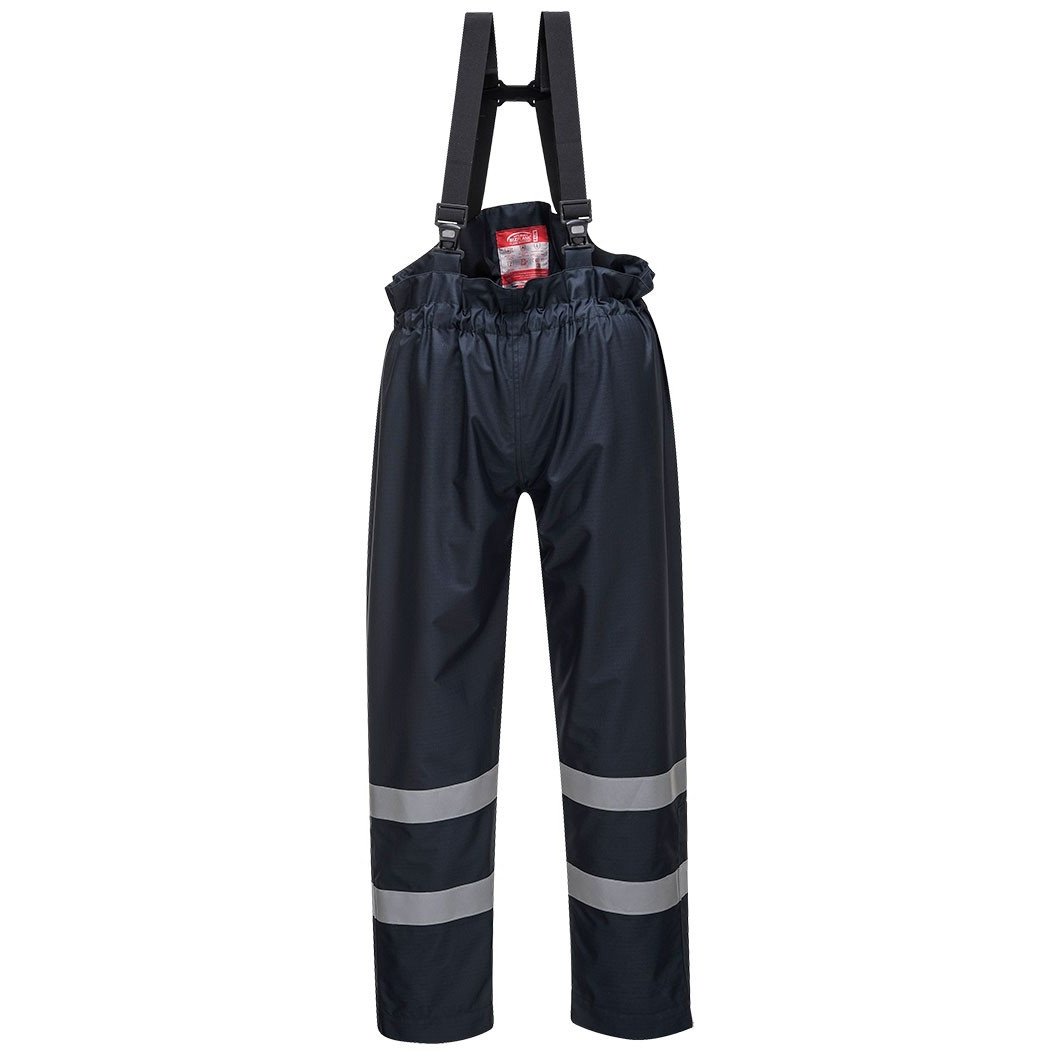 Portwest S772 Bizflame Rain FR Multi Protection Unlined Trouser SKU: WC-6836 Ship to Select country United Kingdom of Great Britain and Northern Ireland United States of America Afghanistan Åland Islands Albania Algeria American Samoa Andorra Angola Anguilla Antarctica Antigua and Barbuda Argentina Armenia Aruba Austria Azerbaijan Bahamas Bahrain Bangladesh Barbados Belarus Belgium Belize Benin Bermuda Bhutan Bolivia (Plurinational State of) Bonaire, Sint Eustatius and Saba Bosnia and Herzegovina Botswana Bouvet Island Brazil British Indian Ocean Territory Brunei Darussalam Bulgaria Burkina Faso Burundi Cabo Verde Cambodia Cameroon Canada Cayman Islands Central African Republic Chad Chile China Christmas Island Cocos (Keeling) Islands Colombia Comoros Congo Congo (Democratic Republic of the) Cook Islands Costa Rica Côte d'Ivoire Croatia Cuba Curaçao Cyprus Czechia Denmark Djibouti Dominica Dominican Republic Ecuador Egypt El Salvador Equatorial Guinea Eritrea Estonia Eswatini Ethiopia Falkland Islands (Malvinas) Faroe Islands Fiji Finland France French Guiana French Polynesia French Southern Territories Gabon Gambia Georgia Germany Ghana Gibraltar Greece Greenland Grenada Guadeloupe Guam Guatemala Guernsey Guinea Guinea-Bissau Guyana Haiti Heard Island and McDonald Islands Holy See Honduras Hong Kong Hungary Iceland India Indonesia Iran (Islamic Republic of) Iraq Ireland Isle of Man Israel Italy Jamaica Japan Jersey Jordan Kazakhstan Kenya Kiribati Korea (Democratic People's Republic of) Korea (Republic of) Kuwait Kyrgyzstan Lao People's Democratic Republic Latvia Lebanon Lesotho Liberia Libya Liechtenstein Lithuania Luxembourg Macao Madagascar Malawi Malaysia Maldives Mali Malta Marshall Islands Martinique Mauritania Mauritius Mayotte Mexico Micronesia (Federated States of) Moldova (Republic of) Monaco Mongolia Montenegro Montserrat Morocco Mozambique Myanmar Namibia Nauru Nepal Netherlands New Caledonia New Zealand Nicaragua Niger Nigeria Niue Norfolk Island North Macedonia Northern Mariana Islands Norway Oman Pakistan Palau Palestine, State of Panama Papua New Guinea Paraguay Peru Philippines Pitcairn Poland Portugal Puerto Rico Qatar Réunion Romania Russian Federation Rwanda Saint Barthélemy Saint Helena, Ascension and Tristan da Cunha Saint Kitts and Nevis Saint Lucia Saint Martin (French part) Saint Pierre and Miquelon Saint Vincent and the Grenadines Samoa San Marino Sao Tome and Principe Saudi Arabia Senegal Serbia Seychelles Sierra Leone Singapore Sint Maarten (Dutch part) Slovakia Slovenia Solomon Islands Somalia South Africa South Georgia and the South Sandwich Islands South Sudan Spain Sri Lanka Sudan Suriname Svalbard and Jan Mayen Sweden Switzerland Syrian Arab Republic Taiwan, Province of China Tajikistan Tanzania, United Republic of Thailand Timor-Leste Togo Tokelau Tonga Trinidad and Tobago Tunisia Turkey Turkmenistan Turks and Caicos Islands Tuvalu Uganda Ukraine United Arab Emirates United States Minor Outlying Islands Uruguay Uzbekistan Vanuatu Venezuela (Bolivarian Republic of) Vietnam Virgin Islands (British) Virgin Islands (U.S.) Wallis and Futuna Western Sahara Yemen Zambia Zimbabwe * Other * Shipping Method Name Estimated Delivery Price No shipping options Apply Email a friend This lightweight, breathable trouser is ideal as an outer layer in hazardous conditions. Flame resistant tape provides enhanced visibility in low light. \n \n- CE certified \n- Guaranteed flame resistance for life of garment \n- Waterproof and breathable with taped seams to prevent water penetration \n- Breathable fabric to draw moisture away from the body keeping the wearer cool, dry and comfortable \n- Premium flame resistant reflective tape \n- Zipped ankles for easy fitting over work boots \n- Back waist buggy for added protection \n- Ergonomic quick release buckle \n- Texpel stain resistant finish repels dirt and stains \n \nColours: Navy \n \nSizes: Reg S - 3XL \n \n- EN ISO 14116 (1/12H/40) \n- EN 1149 -5 \n- EN 13034 Type 6 \n- EN 343 Class 3:3