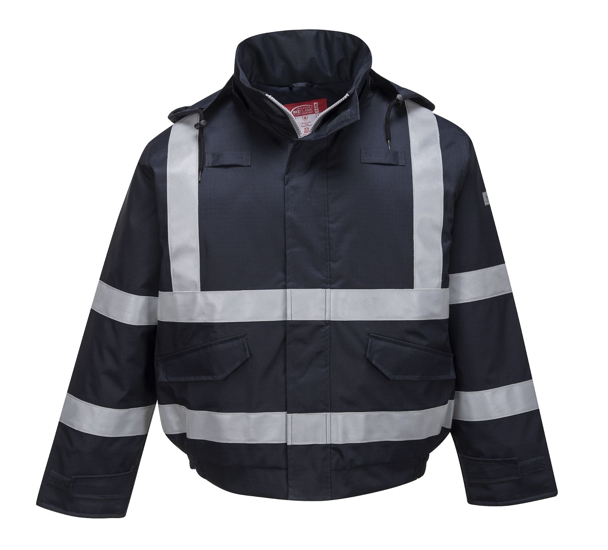 Portwest S783 Bizflame Rain FR Multi-Protection Bomber Jacket SKU: WC-6792 Ship to Select country United Kingdom of Great Britain and Northern Ireland United States of America Afghanistan Åland Islands Albania Algeria American Samoa Andorra Angola Anguilla Antarctica Antigua and Barbuda Argentina Armenia Aruba Austria Azerbaijan Bahamas Bahrain Bangladesh Barbados Belarus Belgium Belize Benin Bermuda Bhutan Bolivia (Plurinational State of) Bonaire, Sint Eustatius and Saba Bosnia and Herzegovina Botswana Bouvet Island Brazil British Indian Ocean Territory Brunei Darussalam Bulgaria Burkina Faso Burundi Cabo Verde Cambodia Cameroon Canada Cayman Islands Central African Republic Chad Chile China Christmas Island Cocos (Keeling) Islands Colombia Comoros Congo Congo (Democratic Republic of the) Cook Islands Costa Rica Côte d'Ivoire Croatia Cuba Curaçao Cyprus Czechia Denmark Djibouti Dominica Dominican Republic Ecuador Egypt El Salvador Equatorial Guinea Eritrea Estonia Eswatini Ethiopia Falkland Islands (Malvinas) Faroe Islands Fiji Finland France French Guiana French Polynesia French Southern Territories Gabon Gambia Georgia Germany Ghana Gibraltar Greece Greenland Grenada Guadeloupe Guam Guatemala Guernsey Guinea Guinea-Bissau Guyana Haiti Heard Island and McDonald Islands Holy See Honduras Hong Kong Hungary Iceland India Indonesia Iran (Islamic Republic of) Iraq Ireland Isle of Man Israel Italy Jamaica Japan Jersey Jordan Kazakhstan Kenya Kiribati Korea (Democratic People's Republic of) Korea (Republic of) Kuwait Kyrgyzstan Lao People's Democratic Republic Latvia Lebanon Lesotho Liberia Libya Liechtenstein Lithuania Luxembourg Macao Madagascar Malawi Malaysia Maldives Mali Malta Marshall Islands Martinique Mauritania Mauritius Mayotte Mexico Micronesia (Federated States of) Moldova (Republic of) Monaco Mongolia Montenegro Montserrat Morocco Mozambique Myanmar Namibia Nauru Nepal Netherlands New Caledonia New Zealand Nicaragua Niger Nigeria Niue Norfolk Island North Macedonia Northern Mariana Islands Norway Oman Pakistan Palau Palestine, State of Panama Papua New Guinea Paraguay Peru Philippines Pitcairn Poland Portugal Puerto Rico Qatar Réunion Romania Russian Federation Rwanda Saint Barthélemy Saint Helena, Ascension and Tristan da Cunha Saint Kitts and Nevis Saint Lucia Saint Martin (French part) Saint Pierre and Miquelon Saint Vincent and the Grenadines Samoa San Marino Sao Tome and Principe Saudi Arabia Senegal Serbia Seychelles Sierra Leone Singapore Sint Maarten (Dutch part) Slovakia Slovenia Solomon Islands Somalia South Africa South Georgia and the South Sandwich Islands South Sudan Spain Sri Lanka Sudan Suriname Svalbard and Jan Mayen Sweden Switzerland Syrian Arab Republic Taiwan, Province of China Tajikistan Tanzania, United Republic of Thailand Timor-Leste Togo Tokelau Tonga Trinidad and Tobago Tunisia Turkey Turkmenistan Turks and Caicos Islands Tuvalu Uganda Ukraine United Arab Emirates United States Minor Outlying Islands Uruguay Uzbekistan Vanuatu Venezuela (Bolivarian Republic of) Vietnam Virgin Islands (British) Virgin Islands (U.S.) Wallis and Futuna Western Sahara Yemen Zambia Zimbabwe * Other * Shipping Method Name Estimated Delivery Price No shipping options Apply Email a friend EN certified, this industry leading flame resistant jacket is ideal for multi-risk environments. The comfortable fit provides the perfect solution for all day wear in cold, wet and hazardous conditions. \n \n- CE certified \n- Guaranteed flame resistance for life of garment \n- Texpel stain resistant finish repels dirt and stains \n- Waterproof and breathable with taped seams to prevent water penetration \n- Flame resistant lining for added protection \n- Taped seams to provide additional protection \n- Premium flame resistant reflective tape \n- Two-way front plastic moulded zip for quick and easy access \n- Storm flap front to protect against the elements \n- 4 pockets for ample storage \n- Side elastic waist for ultimate wearer comfort \n- Internal chest pocket \n- Concealed detachable hood \n- Hook and loop cuffs for a secure fit \n- Radio loops for easy clipping of a radio \n \nColours: Navy \n \nSizes: Reg S - 3XL \n \n- EN ISO 14116 Index 3 (/12H/40) \n- EN 1149 -5 \n- EN 13034 Type 6 \n- EN 343 Class 3:1